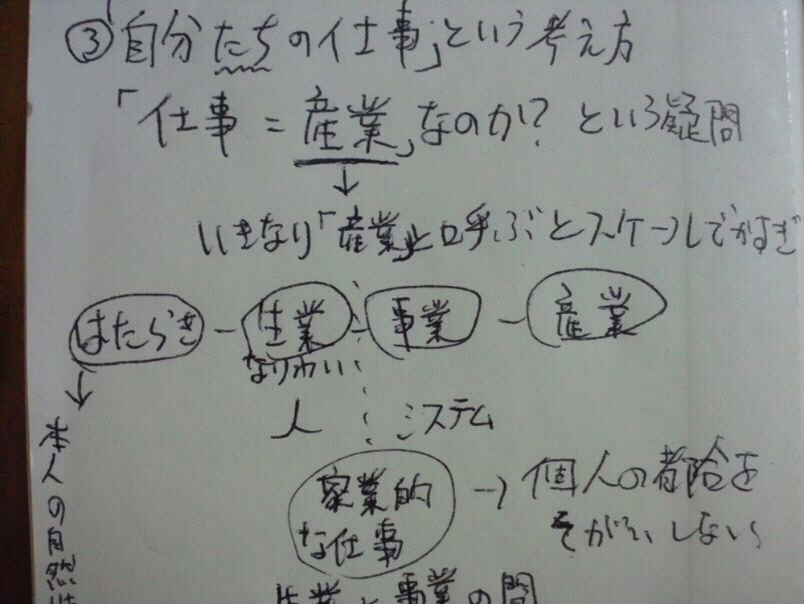まさにこれぐらいの規模で、まず僕は生きていきたいと考えていました。西村さんいわく、仕事の規模によっていくつかあり方があって、「はたらき」「生業」「事業」「産業」というように段階を経て認識されるものなのではないかと。「生業」と「事業」の間あたりにくるのが「家業的な仕事」でした。東北の復興プロジェクトなどでは、いきなり「産業育成」ということばが出てくることも多いらしいですが、僕はそれぞれの仕事が必ずしも「産業」ほど大きい規模である必要はないと感じました。