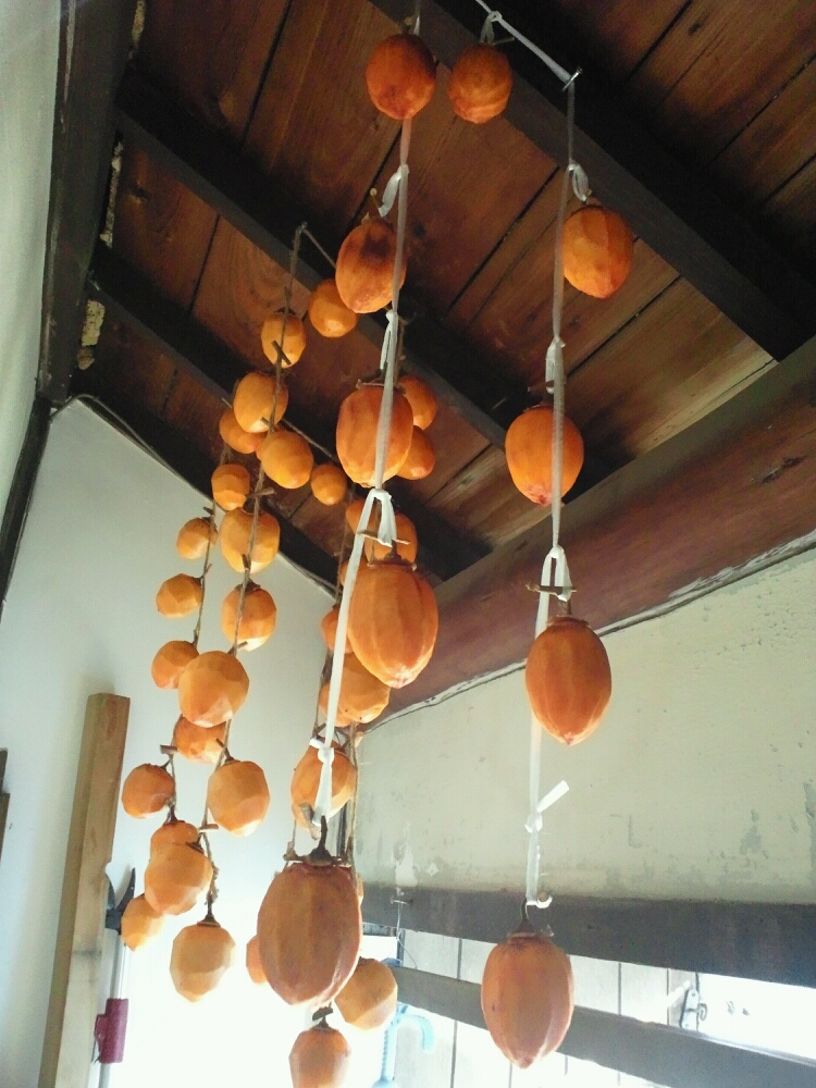 未だたわわに実る渋柿。1000個吊したらしく、家族の台所でも何かごか売ったみたいで、それでもなおこんなふうに実っている木が数本。すごい!