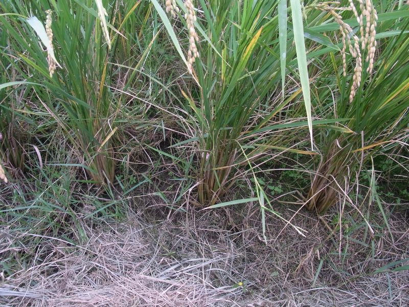 自然農で育った米。よく見ると根元のほうは雑草も生えています。除草剤や農薬・肥料は一切使わず、米の生育が他の草に負けないよう少しだけ草を刈ったりして手助けするそうです。